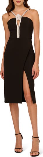 Bring the glam to every cocktail party and gala event in this striking midi dress made from soft stretch crepe and adorned with sparkling rhinestones and a glittering rosette so you shimmer all night long.