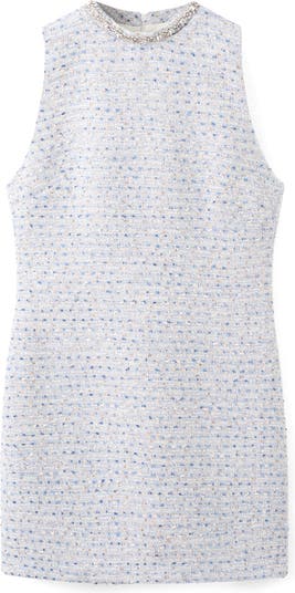 Shimmering metallic threads elevate this figure-skimming sleeveless dress made from classic workday tweed and adorned with lustrous neckline crystals.