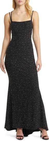 Lustrous rhinestones illuminate this square-neck gown designed with a strappy open back.