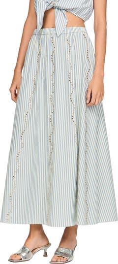 Long, flared striped skirt with wave-set rhinestones and a high elasticated waist.