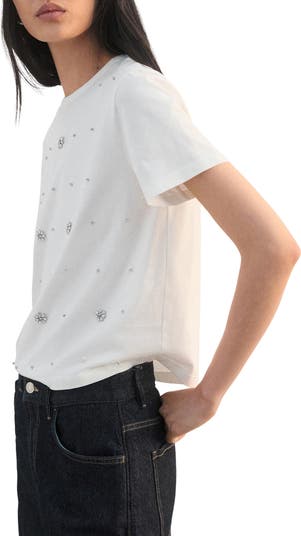 Glittering rhinestones sparkle across the front of this soft cotton T-shirt, elevating an everyday staple into something extra special.