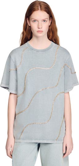 Long, loose-fit T-shirt with a round neck and short sleeves, embellished with rhinestones.