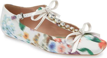 Round-cut rhinestones graduate up the T-strap of this floral-print-satin ballet flat shaped with a square toe, secured with an ankle strap and made extra charming by a pair of primly tied bows.
