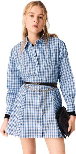 The Maje woman asserts herself with a new strength, capturing everyone's attention with bold, graphic and modern details.This flared shirt dress combines the timeless elegance of blue and white gingham with a contemporary sparkle, thanks to a fabric entirely covered in rhinestones and side panels cut on the bias for a sophisticated visual interplay. Its A-line cut, engraved round buttons and sparkling texture create a unique look that is both refined and decidedly metropolitan.Wear it with a fine-knit sweater underneath, a black belt at the waist for a touch of contrast, an M bag and loafers for a structured and comfortable look.