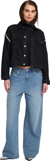Classic denim jacket silhouette updated with a fun, statement-making rhinestone shoulder trim Snap button front closure adds ease and a clean, timeless look to the jacket Boxy, relaxed fit layers easily over knits or tees without feeling bulky Rhinestone detailing creates subtle sparkle while keeping the vibe edgy and wearable Button-flap chest pockets add structure and a bit of everyday utility Soft, non-stretch denim offers structure while staying comfortable for all-day wear