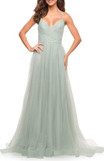 A-line tulle ballgown with high slit, pockets, and rhinestones. Wrap style top with ruching and thin lace up back straps. Back zipper closure.