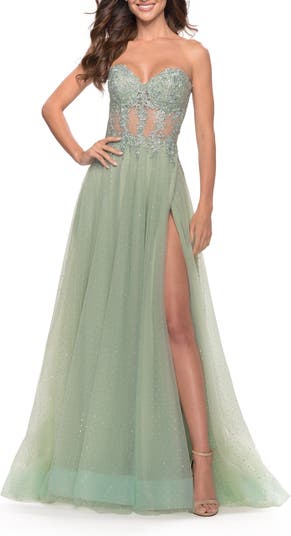 Strapless sweetheart tulle gown covered in rhinestones. The bodice features lace applique on the sheer waist and cups. Back zipper closure.