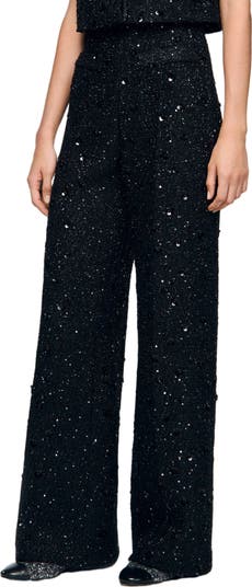 Straight-leg, wide-leg tweed trousers embellished with pearls and sequins.