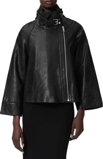 This standout goatskin-leather jacket brings a modern update to its classic moto roots with an exaggerated, belted collar and wide, bracelet-length sleeves.