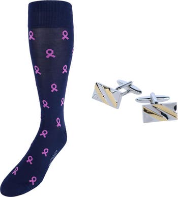 The smart-dressed man knows that attention to detail is the finishing touch to any well-polished look. Set yourself apart from the boring cufflinks and add a bit of color, while still being able to match easily to any suit or tuxedo. Made of rhodium and gold, these cufflinks make a thoughtful surprise for the hard-to-buy gentleman. The socks are classic pink breast cancer awareness ribbons repeat all over this navy sock. Soft, comfortable, and made in the US, this sock is a must-have in your wardrobe. Wear them as you honor those you know and love. An excellent gift idea for Father's Day, graduations, groomsmen, and birthdays.