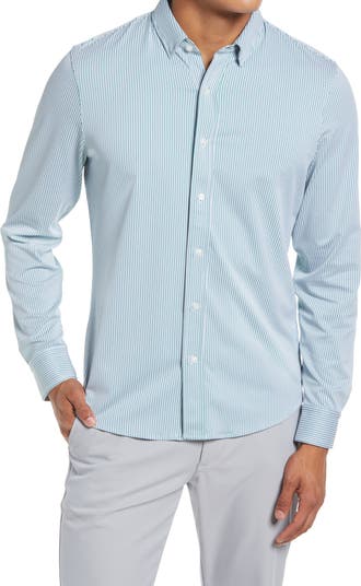 Stretchy, wrinkle-resistant fabric keeps you comfortable and looking smart in a pinstripe shirt that wicks away moisture and makes a great choice for travel.