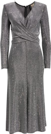 Dazzling light-catching sequins enhance the allure of this glamorous midi made with a wrapped bodice and a perfectly draped skirt.