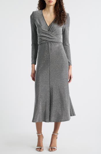 Dazzling light-catching sequins enhance the allure of this glamorous midi made with a wrapped bodice and a perfectly draped skirt.