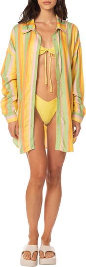 Unwind by the water or wander the shoreline in this oversized cover-up shirt patterned in sherbet-hued stripes and detailed with a macramé-lace sun cutout in back.