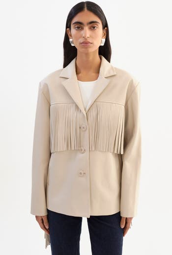 A statement layer with effortless attitude. The Rianne Leather Fringe Jacket is crafted from smooth leather and finished with dramatic fringe that moves with you, adding texture and presence without feeling overdone. Its boxy, straight cut keeps the look modern and easy, while classic tailoring details ground it in everyday wearability. Designed to stand out, yet simple to style, this is the kind of jacket that elevates even the most pared-back look.