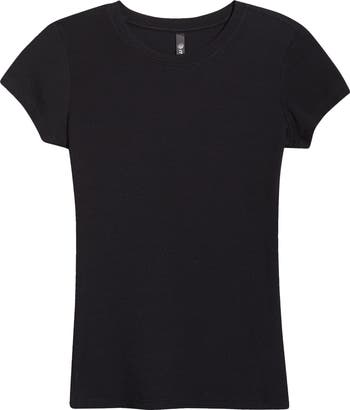 Ribbed fabric and four-way stretch give this fitted baby tee a close, flexible feel fit lightweight breathability.