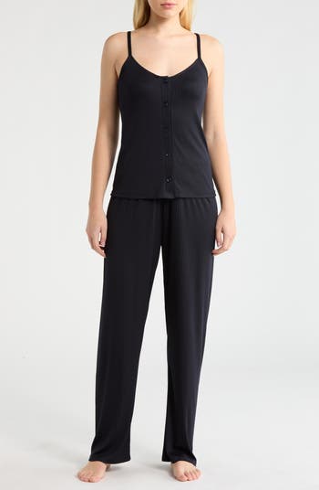 Allover ribbing enhances the soft texture of this sweet sleep set that includes a close-fitting front-button cami and comfy tie-waist pants.