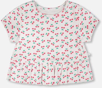 This rib crop t-shirt with frill in white with printed cherries brings a fresh and playful vibe to her summer days. This cropped top is finished with a frilled hem, a round neckline, and short sleeves, making it easy to pair with shorts or skirts. The cotton rib fabric with added stretch and an allover cherry print offers comfort and breathability for everyday wear.
