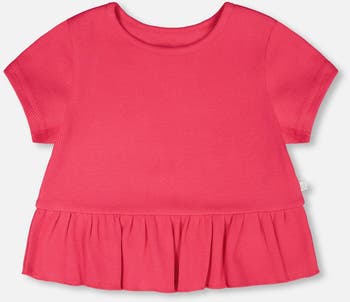 This rib crop t-shirt with frill in pink brings a fresh and playful vibe to her summer days. This cropped top is finished with a frilled hem, a round neckline, and short sleeves, making it easy to pair with shorts or skirts. The cotton rib fabric with added stretch offers comfort and breathability for everyday wear.