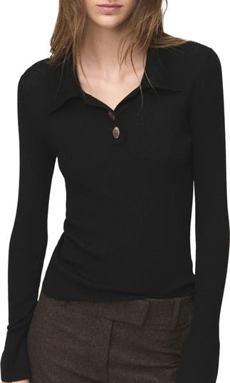 Fine ribbed knitting brings the softest texture to this wool-kissed sweater done with a polo collar, fluted long sleeves and unique stone buttons.