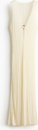 Sleeveless, ankle-length beach dress in a sheer rib knit. Low-cut V-neck, keyhole opening at front with a plastic ring, and a straight hem with a high slit at sides.