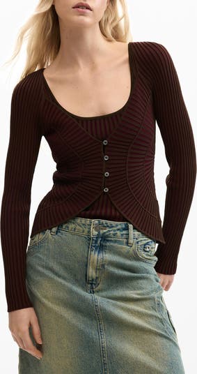 This V-neck rib-knit cardigan is designed with a paneled construction that creates a contoured, slim fit. Finished with a four-button front, the streamlined silhouette layers easily while maintaining a clean, shaped look.