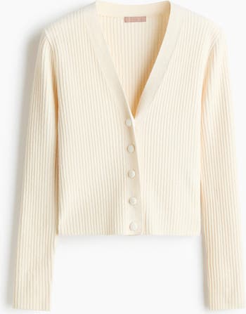 Short, fitted cardigan in a soft rib knit with a V-neckline and covered buttons down the front.