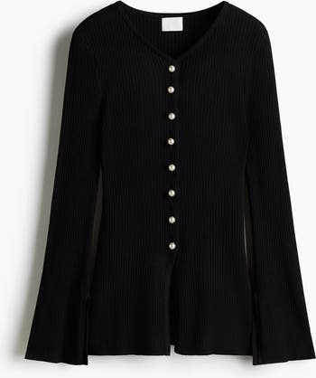 Long, fitted cardigan in a rib-knit viscose blend with a finely ribbed trim around the edges. V-neckline, domed buttons down the front and long sleeves.