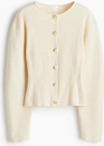 Fitted cardigan in a rib knit with a round neckline, marbled buttons down the front and a nipped-in waist for a flattering silhouette. Dropped shoulders and long sleeves that taper to the cuffs.