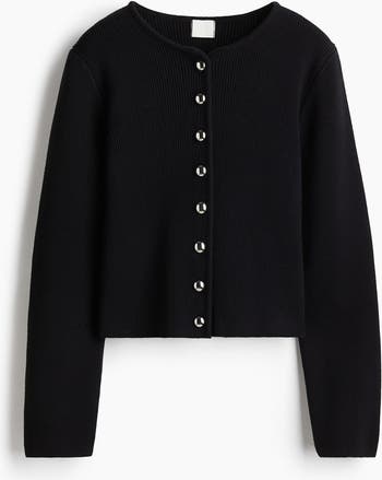 Short, fitted cardigan in soft, rib-knit cotton featuring a round neckline, shiny metal buttons down the front and long sleeves. Detailed with a tubular trim around the neckline and down the front.