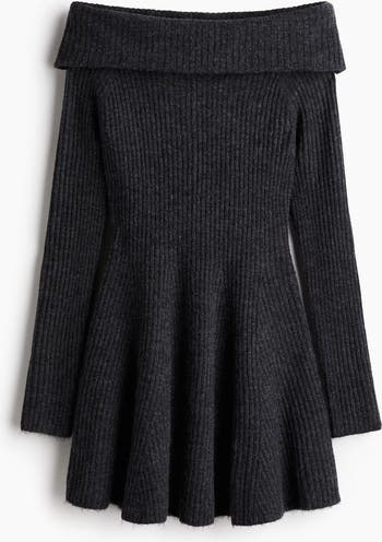 Short, off-the-shoulder dress in a soft rib knit with long sleeves, a wide foldover at the top and a flared skirt.