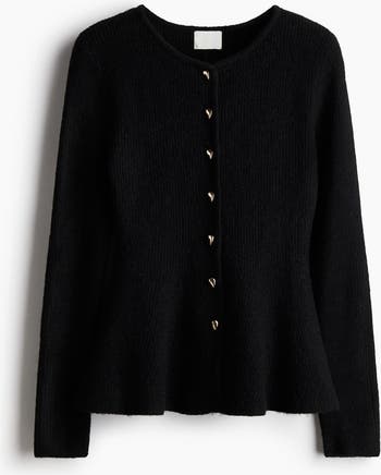 Fitted cardigan in a soft rib knit with a round neckline, metal buttons down the front and a fully-fashioned section that creates a flared peplum.