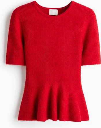 Fitted top in a soft rib knit with a round neckline, short sleeves and a flared peplum.