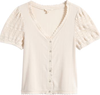 Lacy sleeves and picot trim sweeten the style story of this button-up shirt cut from a ribbed knit for a look that's equal parts polished and comfortable.