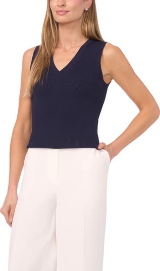 A classic V-neckline tops this rib-knit sleeveless sweater that brings easy polish to everyday layering.