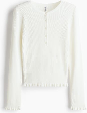 Fitted top in a fine rib knit with a round neckline, button placket and long sleeves. Frill trim at the cuffs and hem.