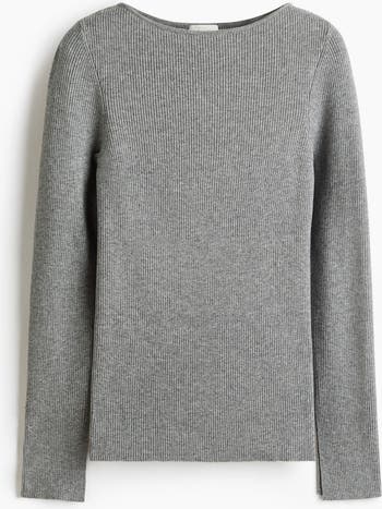 Long, fitted top in a soft rib knit featuring a boat neckline with a tubular trim and long sleeves with a slit at the cuffs.
