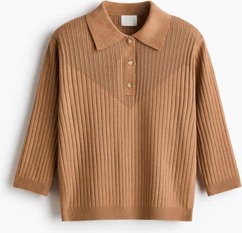 Short top in a fine rib knit with a collar, button placket and 3/4-length sleeves. Ribbing at the cuffs and hem.