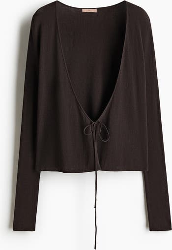 Fitted cardigan in a soft, rib-knit cotton blend featuring a V-neckline and a wrapover front with narrow ties at the waist.