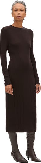 A tea length dress is crafted in an exceptionally soft and stretchy wool, offering a countering effect accentuated by curved seaming. Our family-run farm partners across Australia, New Zealand, and Uruguay compassionately raise and shear their sheep in exemplary conditions, free of the cruel practice of mulesing.