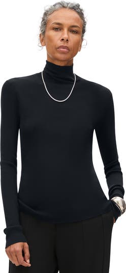 A finely ribbed turtleneck offers a sleek silhouette in this contouring fit. Our family-run farm partners across Australia, New Zealand, and Uruguay compassionately raise and shear their sheep in exemplary conditions, free of the cruel practice of mulesing.