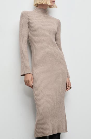 Shaped by soft ribbing, this curve-skimming dress is elegantly framed by a mock neckline and fluted long sleeves.