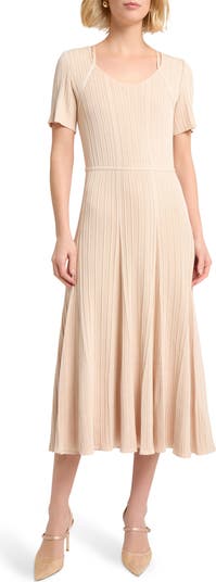 Variegated ribbing adds tonal texture to a desk-to-dinner dress accented with a novel strap detail for extra style points.