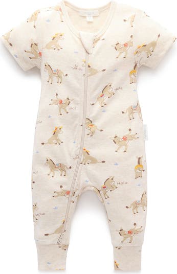 Our Rib Zip Romper is practical style, great for little ones who are already walking. This style is also handy for fast growers, so that their leg length isn't restricted by built in feet. Featuring a fun, all over animal print and a two way zip all the way through with safety folds for quick and easy dressing. Made from soft 100% Cotton for a stretchy, breathable growsuit.