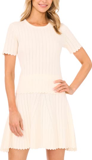Narrow ribs and pointelle detailing texture a lightweight sweater framed by short sleeves with sweetly scalloped cuffs.