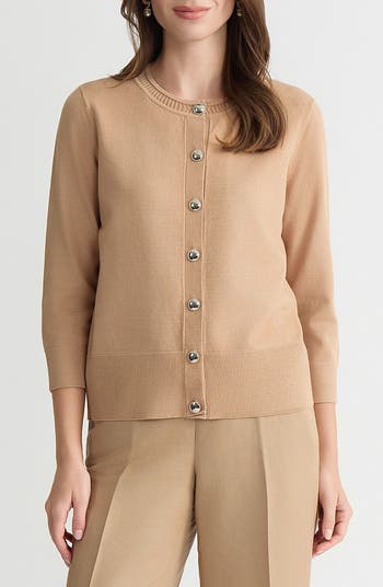 Bezeled high-shine buttons adorn this soft fine-gauge cardigan framed by three-quarter sleeves.