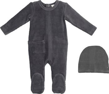 A matching hat lends extra coverage to this rib velour footie set sweetened with a pint-sized pocket.