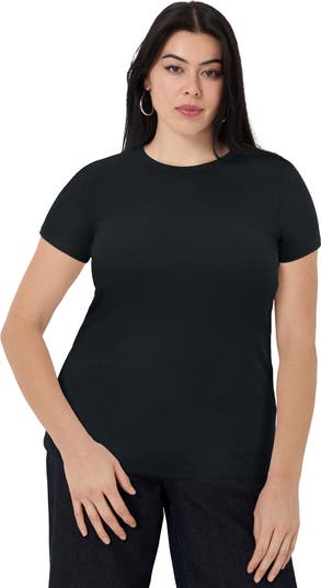 This fitted ribbed crewneck top features a classic short sleeve design and a sleek, streamlined silhouette. Crafted from a soft knit, it offers a comfortable, stretchy fit for everyday wear.