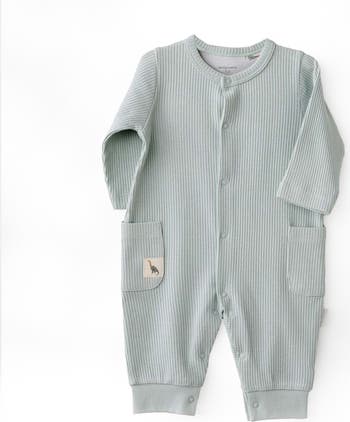 A gentle essential for everyday comfort, this light green romper is crafted from soft ribbed fabric with smooth cuffs for a snug, secure fit. Snap buttons down the front make changes a breeze, while the giraffe patch adds a sweet, playful accent to the dual-pocket design. Snap-front closure for quick dressing and diaper access. Ribbed texture with soft cuffs for cozy wearability. Front patch pocket with giraffe motif for a charming finish.