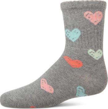 Here's a fresh, fun way to keep her tootsies toasty: our rib-knit crew-length socks adorned with colorful hearts. The super-soft cotton blend stretches for flexible fit, while the non-chafe heel and toe ensure comfort at every step. Comfortable Cotton Blend Stay-Up Rib-Knit Top Reinforced Heel and Toe Seams Trendy Graffiti Graphics